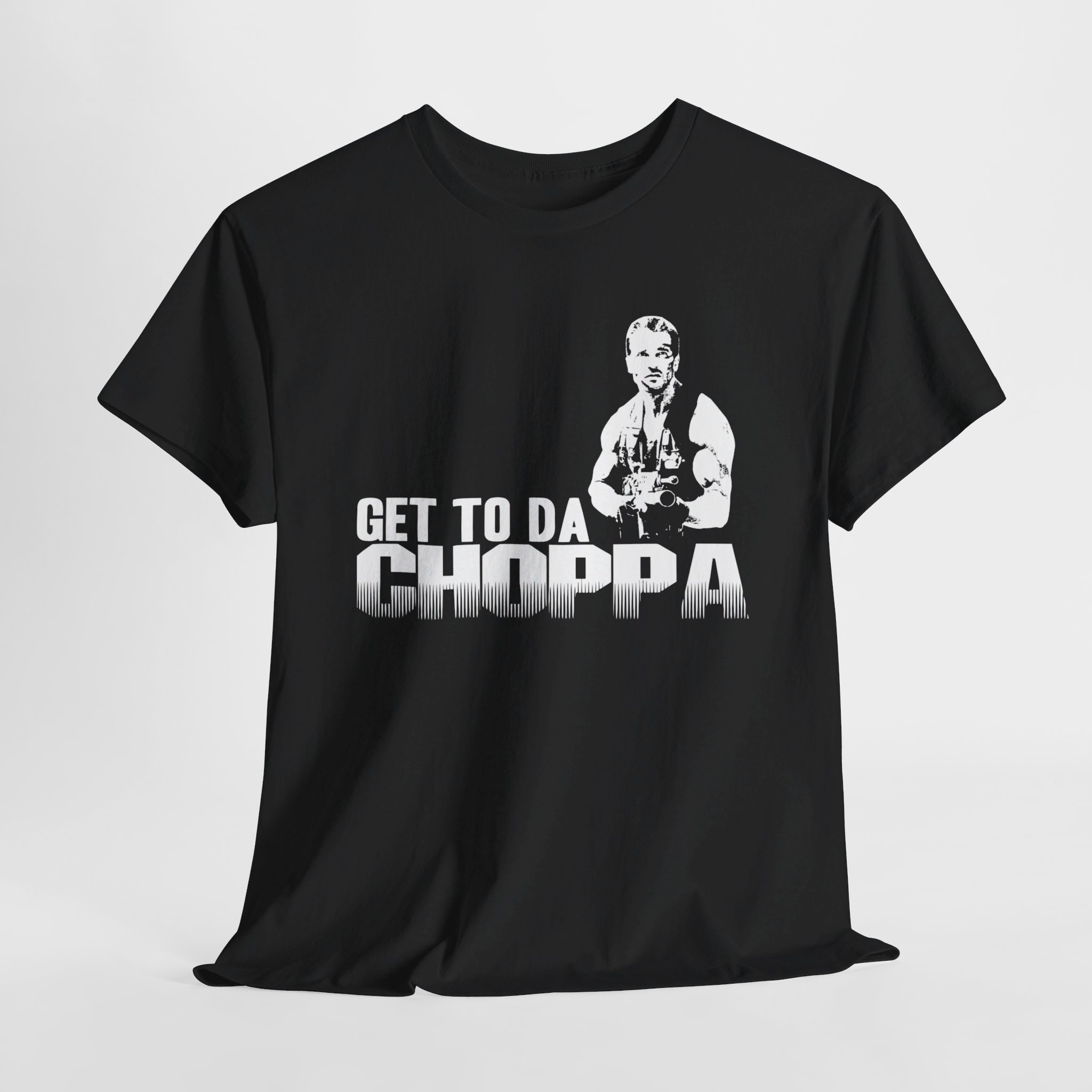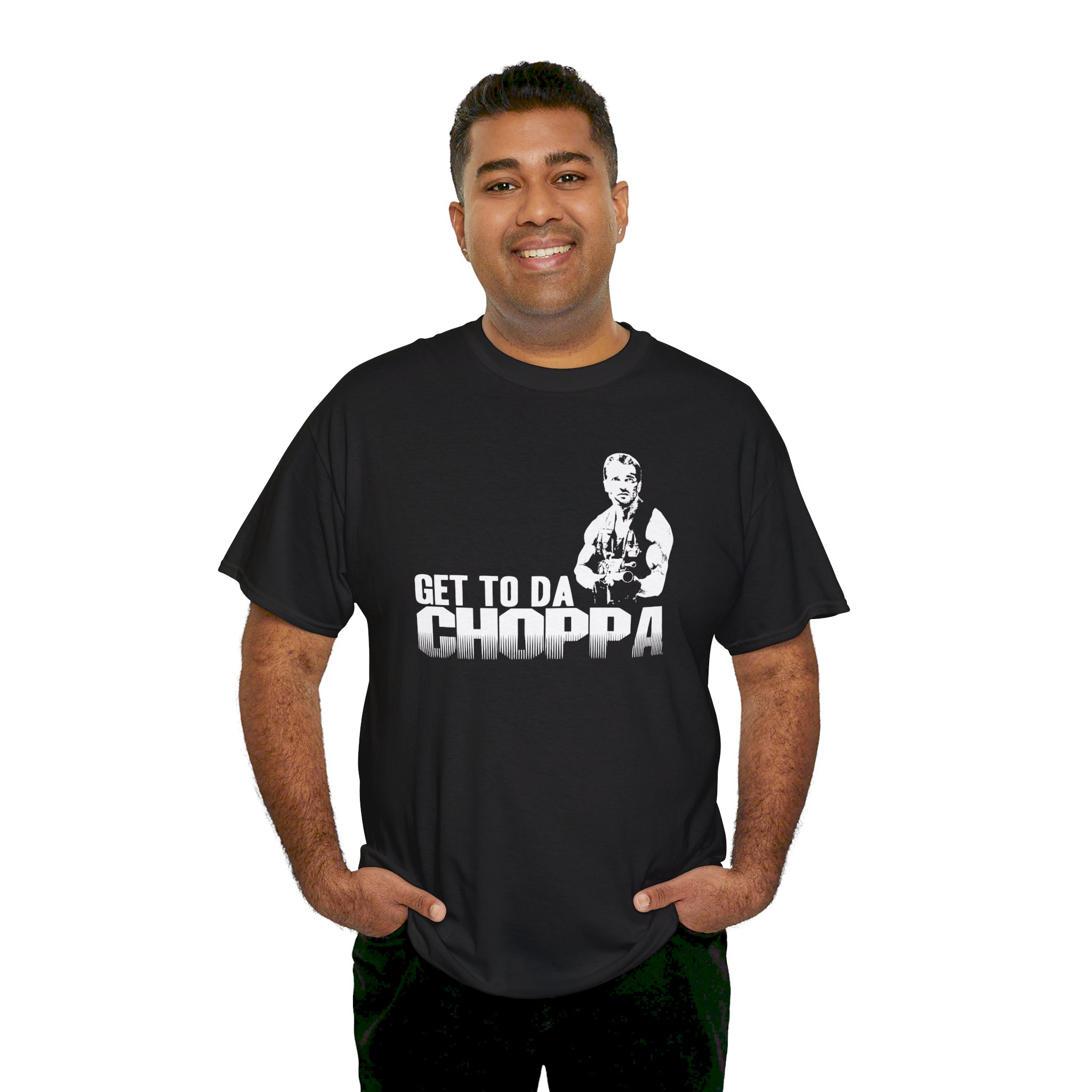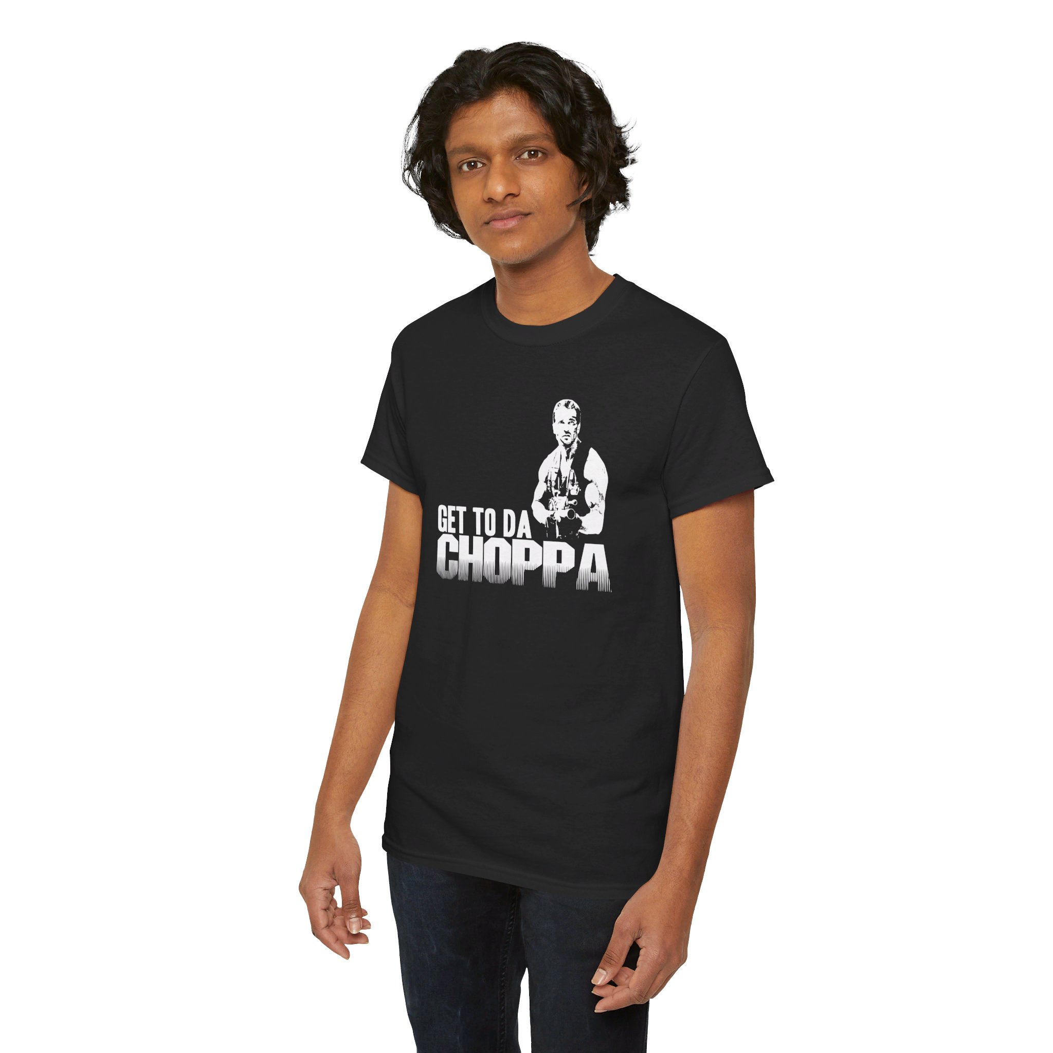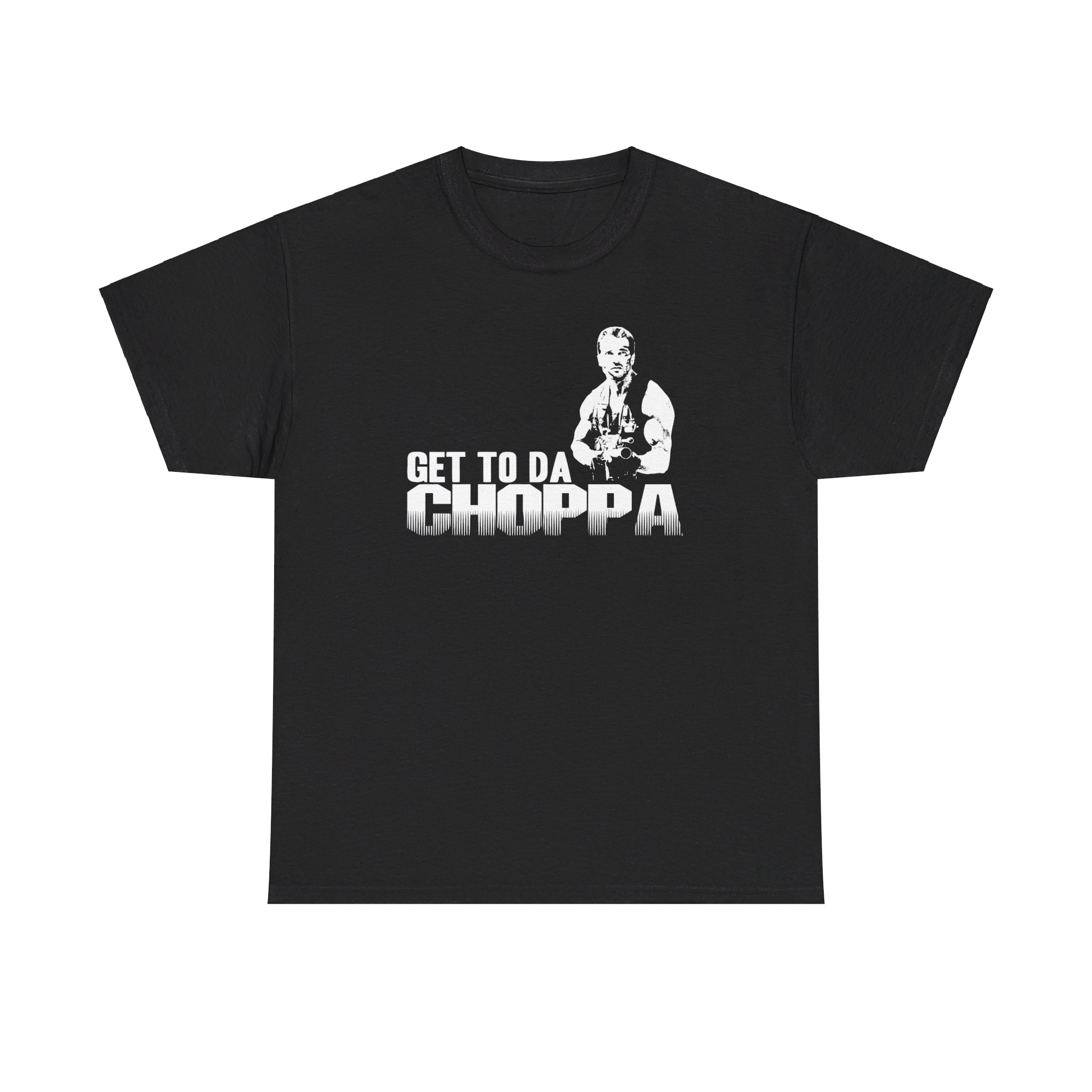 Get to da Choppa The unisex heavy cotton tee is the basic staple of any wardrobe. It is the foundation upon which casual fashion grows. All it needs is a personalized design to elevate things to profitability. The specially spun fibers provide a smooth surface for premium printing vividity and sharpness. No side seams mean there are no itchy interruptions under the arms. The shoulders have tape for improved durability.