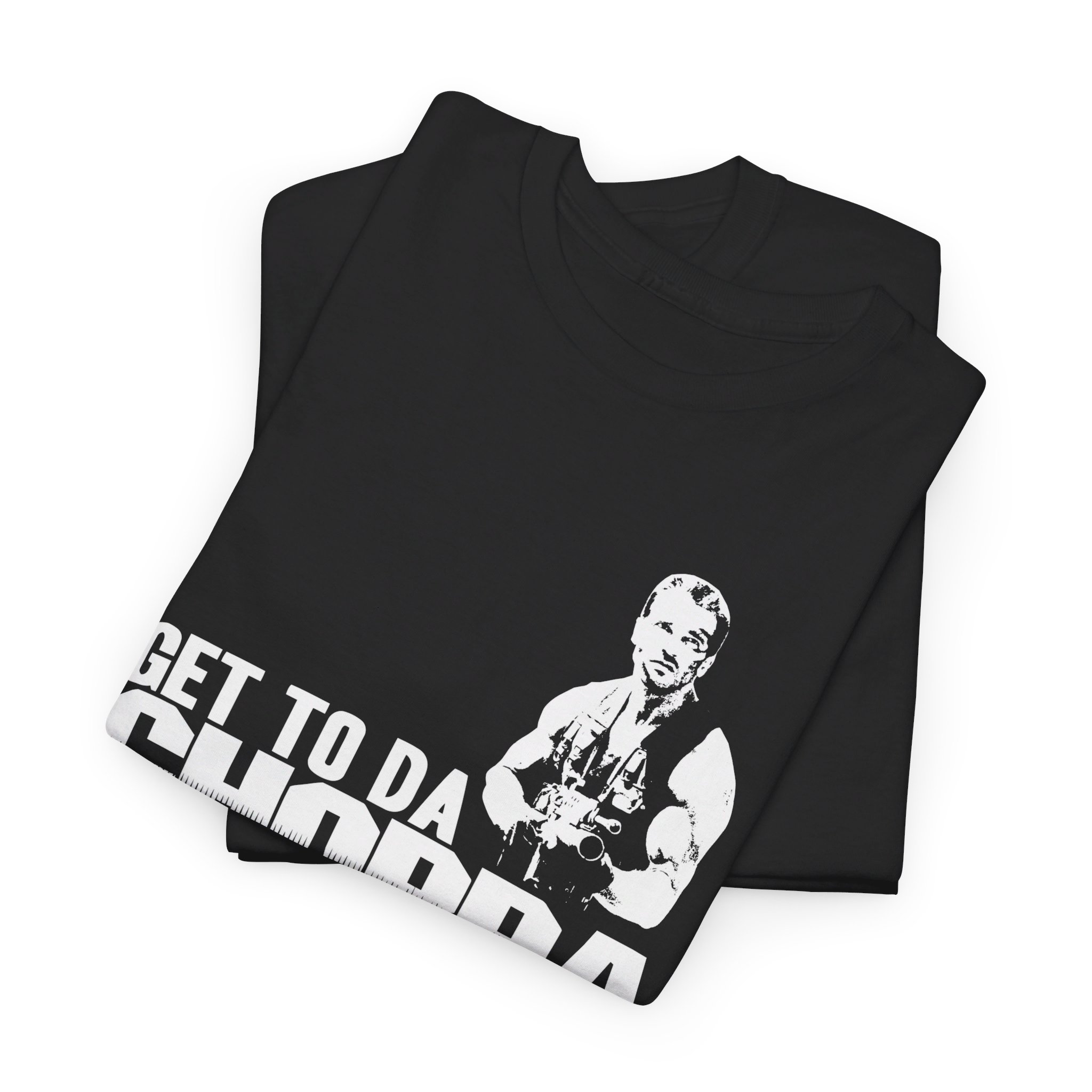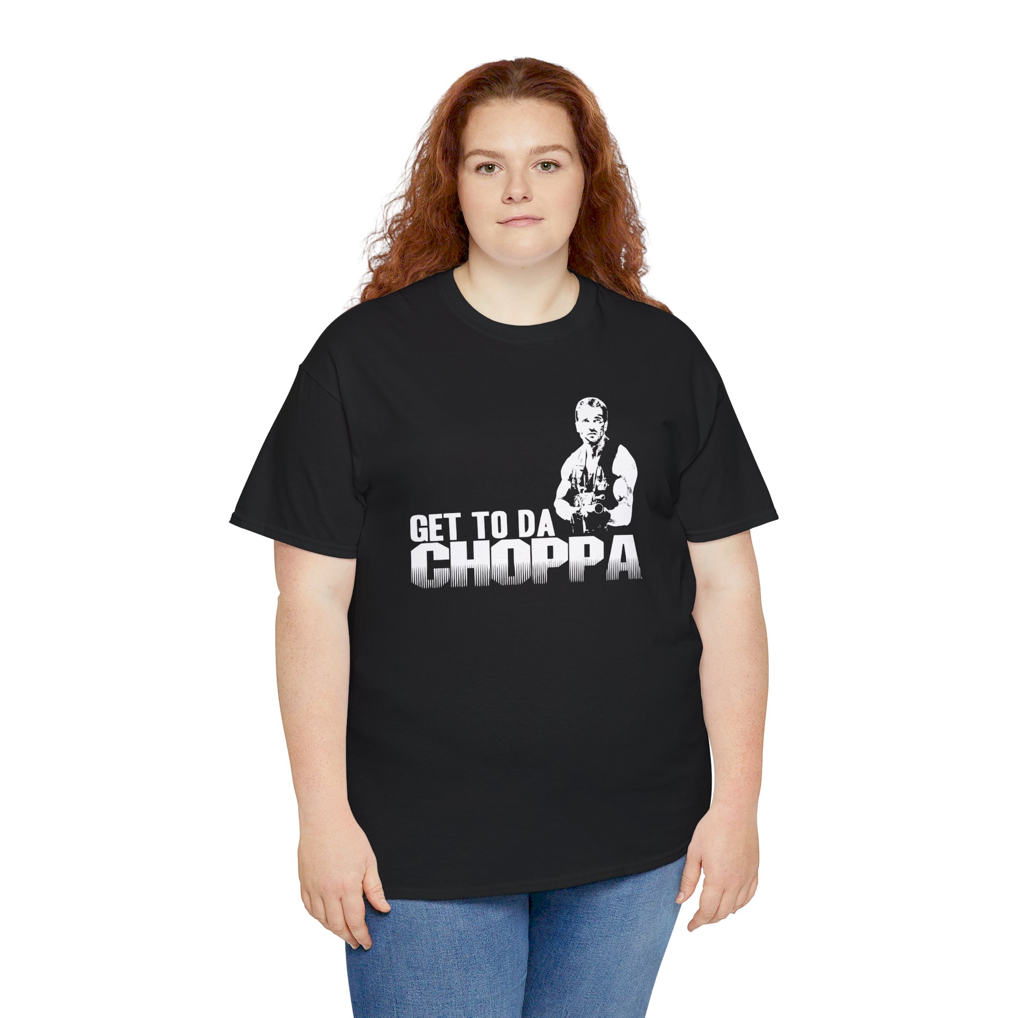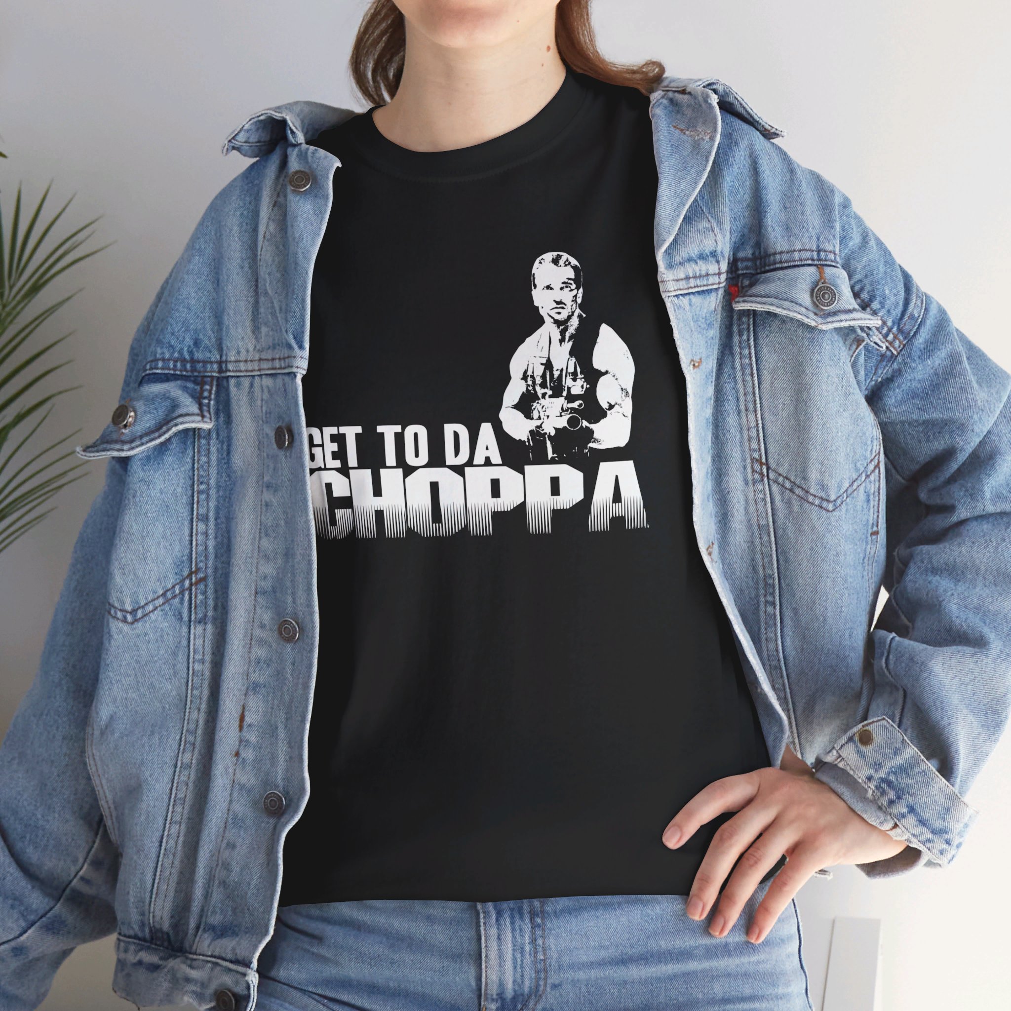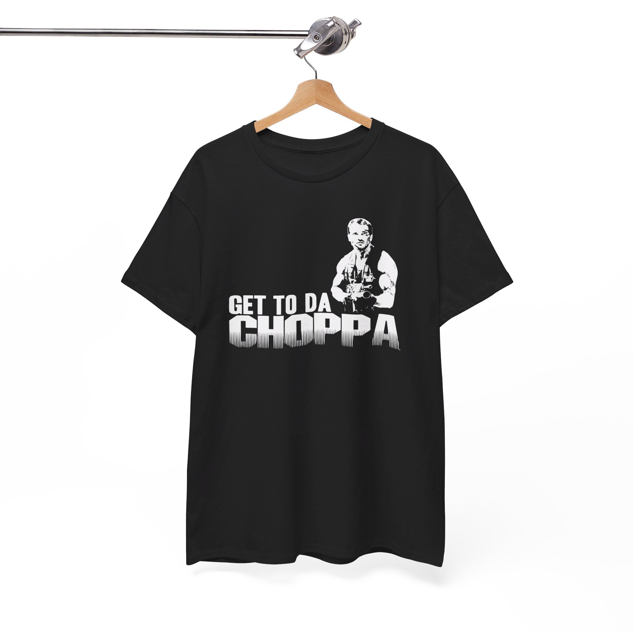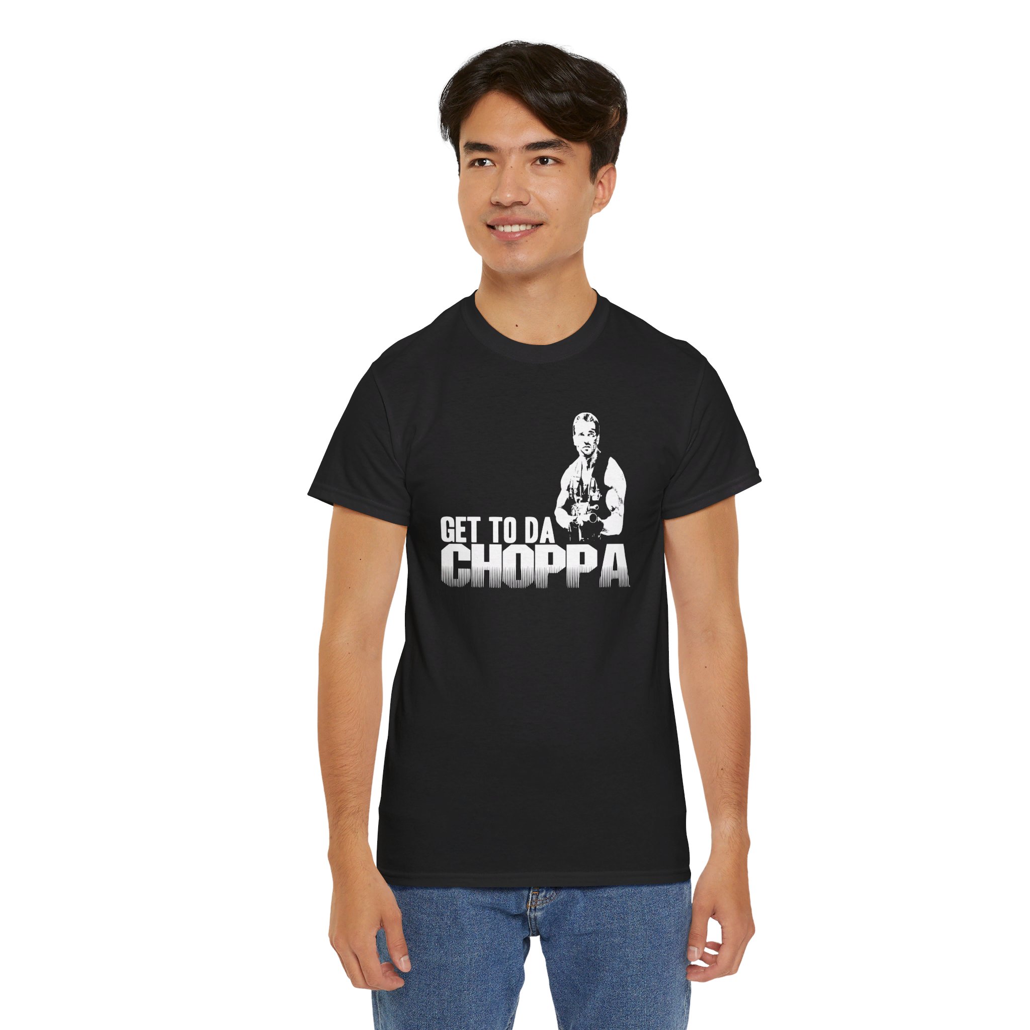 Get to da Choppa The unisex heavy cotton tee is the basic staple of any wardrobe. It is the foundation upon which casual fashion grows. All it needs is a personalized design to elevate things to profitability. The specially spun fibers provide a smooth surface for premium printing vividity and sharpness. No side seams mean there are no itchy interruptions under the arms. The shoulders have tape for improved durability.